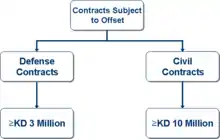 Often, the proclaimed aim of this process is to even-up a country's balance of trade.[3] However, some forms of offsets transactions do not represent trade flows going from the initial importer towards the initial exporter. Offsets are frequently an integral part of international defense contracts.[4]