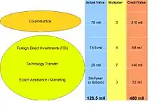 - Co-production: Nation P chooses one or more local companies to manufacture some components of the tanks, such as turrets and some of the internal components. The actual value of the components is $70 million. Nation P assigns a multiplier of 3, since this develops capabilities of its military industrial base and creates jobs in Nation P. The total credit value for the fulfillment of the overall offset obligation is $70M x 3 = $210M.
