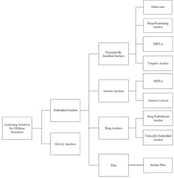 Each of several embedded-anchor types presents its own advantages for anchoring offshore structures. The choice of anchoring solution depends on multiple factors, such as the type of offshore facility that requires mooring, its location, economic viability, the lifetime of its use, soil conditions, and resources available.