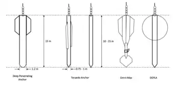Deep-penetrating and torpedo anchors are designed to reach maximum velocities of 25–35 metres per second (82–115 ft/s) at the seabed, allowing for tip penetration of two to three times the anchor length, and holding capacities in the range of three to six times the weight of the anchor after soil consolidation.[1]