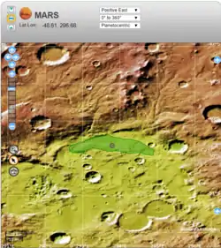Ogygis Undae is the only named southern hemisphere dune field on Mars.[1] It is named after one of the classical albedo features on Mars, Ogygis Regio.[2] Its name, which refers to Ogyges, a primeval mythological ruler in ancient Greece,[2] was officially approved by the International Astronomical Union (IAU) on September 17, 2015. It is situated just outside Argyre Planitia, a plain located in the southern highlands of Mars.[3] The dunes of Ogygis Undae extend from latitude −49.94°N to −49.37°N and from longitude 292.64°E to 294.93°E (65.07°W – 67.36°W).[2] They are centered at latitude −49.66°N, longitude 293.79°E (66.21°W), and extend approximately 87 km to the east and west from there.[4][2] Ogygis Undae has an area of 1904 km2, and due to its large size is a primary subject for research on Martian dune morphology and sand composition.[4][3]