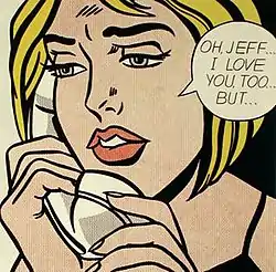 In the early 1960s, Lichtenstein produced several "fantasy drama" paintings of women in love affairs with domineering men causing women to be miserable, such as Drowning Girl, Hopeless and In the Car. These works served as prelude to 1964 paintings of innocent "girls next door" in a variety of tenuous emotional states such as in Oh, Jeff...I Love You, Too...But....[6] Using only a single frame from its source, Oh, Jeff...I Love You, Too...But...'s graphics are quite indicative of frustration, but the text in the speech balloon augment the romantic context and the emotional discord.[7] After 1963, Lichtenstein's comics-based women "...look hard, crisp, brittle, and uniformly modish in appearance, as if they all came out of the same pot of makeup." This particular example is one of several that is cropped so closely that the hair flows beyond the edges of the canvas.[8] This was painted at the apex of Lichtenstein's use of enlarged dots, cropping and magnification of the original source.[9] The tragic situations of his subjects makes his works a popular draw at museums.[3]