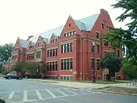 Ohio State's 1,764-acre (714 ha) main campus is about 2.5 miles (4.0 km) north of the city's downtown. The historical center of campus is the Oval, a quad of about 11 acres (4.5 ha).[33] The original campus was layed out in the English country style with University Hall overlooking what would become the Oval. From 1905 to 1913, the Olmstead Brothers, who had designed New York City's Central Park, were contracted as architectural consultants. Under their leadership, a more formal landscape plan was created with its center axis through the Oval. This axis shifted the university's street grid 12 1/4 degrees from the City of Columbus' street grid. Construction of the main library in 1915 reinforced this grid shift.[34]