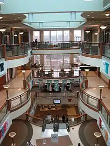 Baker Center contains a large food court called West 82; a pub bistro called Latitude 39; a Grand Ballroom; The Honors Collegium, The Wall of Presidents, the Bobcat Student Lounge, a shop called Bobcat Depot that sells apparel, computers, and accessories; a theater seating 400; study areas; computer labs; administrative offices; and numerous conference rooms. The Frontier Room, a large coffee house named after a former popular university rathskeller, features a stage, artwork and a community fireplace. It serves Starbucks products and university bakery items and is housed on the fourth floor, which opens onto its own outside terrace as well as onto the intersection of Park Place and Court Streets, making it a hot spot for students between classes. Other amenities include a United States Post Office[41] and the Trisolini Art Gallery, named after a prominent fine arts faculty member.[42]