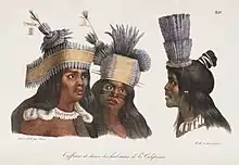 Generally, men did not wear clothing in warm weather. In cold weather, they might don animal skin capes or feather capes. Women commonly wore deerskin aprons, tule skirts, or shredded bark skirts. On cool days, they also wore animal skin capes. Both wore ornamentation of necklaces, shell beads and abalone pendants, and bone wood earrings with shells and beads. The ornamentation often indicated status within their community.[14]