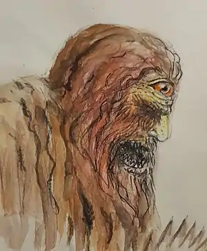 The Ojáncanu (Cantabrian: [oˈhankanu]) is a cyclops found in Cantabrian mythology, and is an embodiment of cruelty and brutality. It appears as a 10 to 16 foot tall giant with superhuman strength, with hands and feet that contain ten digits each, and two rows of teeth. With a very wild and beast-like temperament, it sports a long mane of red hair, and just as much facial hair, with both nearly reaching to the ground. Apparently the easiest way of killing an Ojancanu is to pull the single white hair found in its mess of a beard. The females (called Ojáncana) are virtually the same, though without the presence of a beard. However, the females have long drooping breasts that like their male counterpart's hair, reach the ground. In order to run, they must carry their breasts behind their shoulders. The strangest thing about these peculiar cyclopean species is their reproduction process. Instead of mating, when an old Ojancanu dies, the others distribute the insides and bury the corpse under an oak or yew tree. He is constantly doing evil deeds such as pulling up rocks, destroying huts and trees, and blocking water sources. He fights Cantabrian brown bears and Tudanca bulls, and always wins. He only fears the Anjanas, the good Cantabrian fairies.[1]