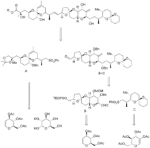 In Isobe's synthesis, the molecule was broken into 3 pieces, along the C14-C15 bonds, and the C27-C28 bonds. This formed fragments A, B, and C, which were all synthesized separately, after which the B and C fragments were combined, and then combined with the A fragment. This synthesis contained 106 steps, with a longest linear sequence of 54 steps. The precursors to all three fragments were all glucose derivatives obtained from the chiral pool. Spiroketals were obtained from precursor ketone diols, and were therefore formed thermally in acid.[5][13][16]