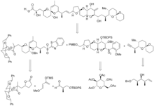 Similar to Isobe's synthesis, the Forsyth synthesis sought to reduce the number of steps, and to increase potential for designing analogues late in the synthesis. To do this, Forsyth et al. designed the synthesis to allow for structural changes and installation of important functional groups before large pieces were joined. Their resulting synthesis was 3% yielding, with 26 steps in the longest linear sequence. As above, spiroketalization was performed thermodynamically with introduction of acid.[5][14]