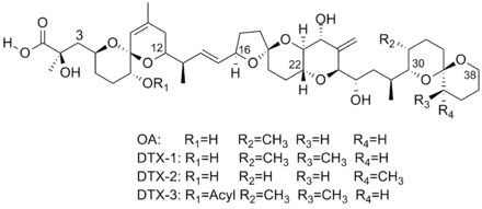 Okadaic acid (OA) and its derivatives, the dinophysistoxins (DTX), are members of a group of molecules called polyketides. The complex structure of these molecules include multiple spiroketals, along with fused ether rings.[1][5]