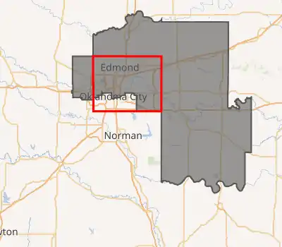 Interactive map of district boundaries, with Oklahoma County highlighted in red. In the 2020 redistricting cycle, parts of the county are drawn into the 3rd and 4th congressional districts in exchange for Lincoln County and parts of Canadian and Logan counties. | |||