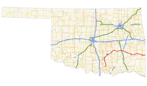 | McAlester | 115.1 | 185.2 | Western end of SH-31 concurrency | ||