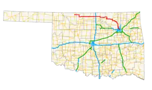 State Highway 11 (abbreviated SH-11) is a state highway in Oklahoma. It runs in an irregular west-to-east path 204.9 miles (329.8 km) across the northern part of the state, from U.S. Highway 281 (US-281) seven miles (11 km) north of Alva to Interstate 244 (I-244) / US-412 in Tulsa. There is one letter-suffixed spur highway branching from SH-11, SH-11A.