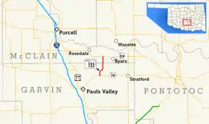 SH-133's southern terminus is at SH-19 seven miles (11 km) northeast of Pauls Valley.[4] The highway begins in Garvin County and crosses into McClain County 2.55 miles (4.10 km) north of SH-19.[1] The highway ends two miles (3.2 km) north of the county line at SH-59 between Rosedale and Byars.[2]