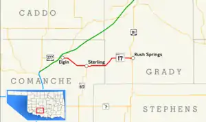 State Highway 17, abbreviated as SH-17, is an east–west highway in Oklahoma. It is a relatively short highway, extending for only 20.86 miles (33.57 km) from U.S. Highway 277 (US-277) in Elgin to Business US-81 in Rush Springs. It has no lettered spur routes (it does not connect to SH-17A in Wynnewood).