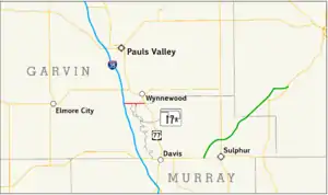 State Highway 17A (SH-17A) is a 3.10-mile (4.99 km) long[1] long state highway in south-central Oklahoma. It connects Interstate 35 (I-35) to U.S. Route 77 (US-77) near Wynnewood. It does not connect to its implied parent, State Highway 17.