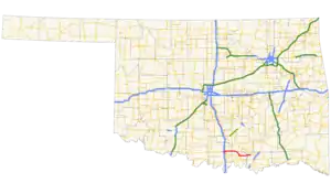 The highway's western beginning is at SH-142 in Ardmore. This intersection is also the eastern terminus of SH-142. After leaving Ardmore, the highway continues along a due east course that takes it through the unincorporated places of Dripping Springs and Caldwell Hill.[3] At Dickson it becomes concurrent with US-177. Shortly after this junction, the two highways cross into Johnston County, where they pass through the town of Mannsville. The routes then turn southeast into Marshall County. Just after the county line lies the southern terminus of SH-1, which leads back into Johnston County.[4]