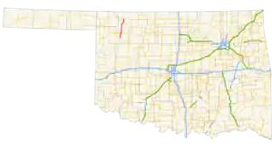 The highway was at its greatest extent from 1958 to 1964, when it started at its present-day southern terminus and continued all the way north to the Kansas state line. However, virtually all of the highway north of Freedom was concurrent with another route. On November 9, 1964, SH-50 was truncated to end at its present-day northern terminus at US-64.[4]