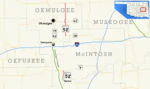 The southern SH-52 is a short, 4.06 miles (6.53 km)[1] state highway in McIntosh County, Oklahoma. It connects State Highway 9 to the town of Hanna.