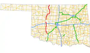 State Highway 58 (abbreviated SH-58) is the name of two state highways in Oklahoma. One of them runs for 72.7 miles (117.0 km) from Medicine Park to the Blaine–Custer County line near Hydro,[1] and the other connects US-270/281/SH-3/33 to the Kansas state line, a length of 105.9 mi (170.4 km).[3] The northern section has one lettered spur route, SH-58A.