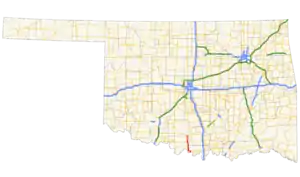 State Highway 89 (abbreviated SH-89 or OK-89) is a state highway in the southern part of the U.S. state of Oklahoma. It runs from the Taovayas Indian Bridge at the Texas state line to State Highway 53, a distance of 30.3 miles (48.8 km). SH-89 was initially designated on July 26, 1944. It has no lettered spur routes.