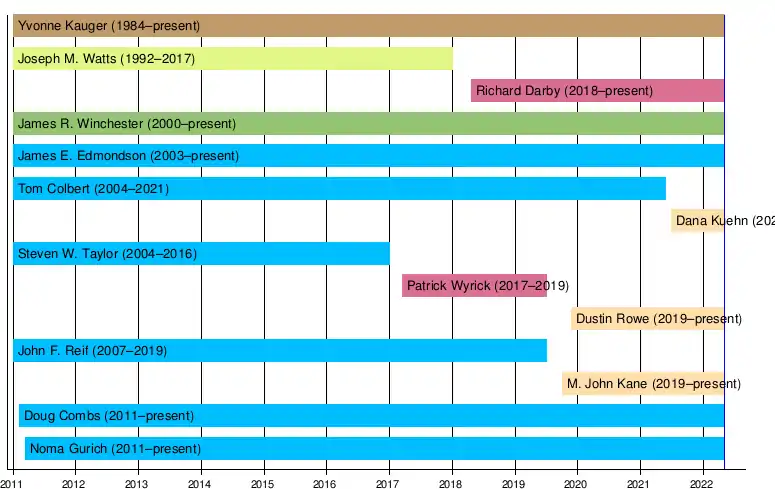 | Joseph M. Watt | 1992 | 2017 | David Walters | Mary Fallin | 15 years | Richard Darby |