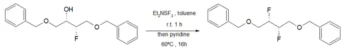 The Olah reagent is a nucleophilic fluorinating agent. It consists of a mixture of 70% hydrogen fluoride and 30% pyridine; alcohols react with this reagent to give alkyl fluorides: