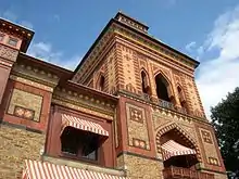 Olana is one of the few intact artists' home-, studio- and estate-complexes in the United States; it was designated a National Historic Landmark in 1965.[1][3] The house is also a prime example of Orientalist architecture.[2] It is owned and operated by the New York State Office of Parks, Recreation and Historic Preservation, and is also supported by The Olana Partnership, a non-profit 501(c)(3) organization.[4] The main building is an architectural masterpiece designed by Frederic Church in consultation with the architect Calvert Vaux.[1][5][6] The stone, brick, and polychrome-stenciled villa is a mixture of Victorian, Persian[3] and Moorish styles.[7] The interior remains much as it was during Church's lifetime, exotically furnished and decorated with objects from his global travels, and with some 40 paintings by Church and his friends. The house is intricately stenciled inside and out; Church designed the stencils based on his travels in the Middle East. The house contains Church's last studio, built as an addition from 1888 to 1890.