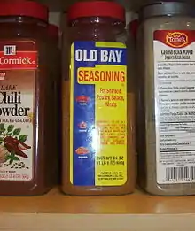 The seasoning is a mix of celery salt, black pepper, crushed red pepper flakes, paprika, and many others.[4][1][5] Some of the other spices that may be used are laurel leaves, mustard, salt, cardamom, cloves, and ginger as listed in the original product in the Baltimore Museum of Industry.[6] It is regionally popular, specifically in Maryland,[7] as well as in the Mid-Atlantic States, the Southern States, parts of New England and the Gulf Coast.[8]