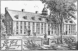 When Yale College moved to New Haven in 1718, the town constructed its first building, the "College House," at the corner of College and Chapel Streets, where Bingham Hall now stands. The wood-framed structure contained all the functions of the college: student rooms, a library, and a combined chapel and dining hall.[1] Falling into disrepair, this building was torn down in stages from 1775 to 1782.[2]