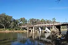 The Old Cobram-Barooga Bridge is a timber truss, lift-span bridge that formerly carried two traffic lanes across the Murray River between Cobram (Victoria) and Barooga (NSW). It is now a pedestrian bridge having been superseded by a parallel bridge for vehicular traffic.[1]