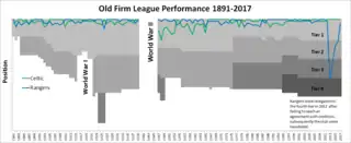 Between them the two clubs have won 106 Scottish League championships (Rangers with 55 and Celtic with 51),[4] 73 Scottish Cups (Celtic with 40 and Rangers with 33),[5] and 47 Scottish League Cups (Rangers with 27 and Celtic with 20).[6] Interruptions to their ascendancy have occurred rarely, mainly in the two decades after the Second World War from 1946 to 1965 when five other clubs all won the senior league, and in the first half of the 1980s with the challenge of the New Firm of Aberdeen and Dundee United. Beginning with the 1985–86 season, one half of the Old Firm has won the Scottish League every season and in all but one of seventeen seasons between 1995–96 and 2011–12, both clubs finished in the top two places. In the early 2010s, Rangers endured financial difficulties, and its holding company was liquidated in 2012. Subsequently, the team had to apply for entry to the bottom (fourth) tier of the Scottish league, climbing to the top division in four seasons and winning the title again in 2020–21 (Celtic were champions in each of the intervening nine campaigns but failed to claim the tenth which would have beaten a record set by them in the 1960s/70s and matched by Rangers in the 1980s/90s). As a result of these circumstances, a proportion of Celtic supporters maintain that the current Rangers is distinct from the pre-2012 club and the rivalry no longer exists under the Old Firm identity[7][8][9] so deliberately avoid using this name, instead using the more generic term Glasgow derby (as does the club itself to appease them).[10][11]