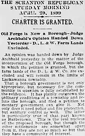 The history of Old Forge can be traced back to 1789 and Dr. William Smith, who was an army surgeon in the American Revolutionary War.[6] During the 1820s, Charles Drake operated the only stagecoach inn between Wilkes-Barre and Carbondale. Drake's son, Ebenezer, secured a post office for Old Forge in 1848, where he served as postmaster until 1885. On May 26, 1871, Old Forge Township was designated, as it previously had been part of Lackawanna Township. Old Forge Borough was incorporated on May 2, 1899.
