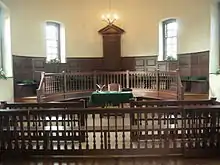 During its 50 years of use as the county courthouse, it was considered the center of life in Isle of Wight and in the town of Smithfield, which was incorporated in 1752.[4] It was constructed by William Rand, and featured a distinctive semi-circular apse and conical roof found in many English churches of the period and echoing the Colonial Capitol in Williamsburg.[5] An adjacent clerk's office was constructed in 1799, although it was only in use for its intended purpose for a year, before the new courthouse at Isle of Wight was constructed. The old Smithfield courthouse was later modified into a family residence. To do so, the arcade was blocked and the roof converted to a gable.[3]