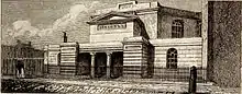 In 1808 the meeting-house was rebuilt in Jewin Street, on a site almost opposite the one it had occupied between 1692 and 1701,[1] for Abraham Rees as minister. (It was distinct from the Jewin Street Chapel, an Independent congregation, also known as "Woodgate's Meeting-House" after the previous minister; at the time the minister there was Timothy Priestley.[3][4] See also the Jewin Welsh Presbyterian Chapel, which had premises on that street.)