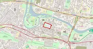 In 1617, a permanent community of Jesuits was established in the city, thanks to the support of inhabitants and the action of Father Jan Kuczborski, Bishop of Chełmno since 1614.[10] They received ownership of several tenements standing at the Market Square, where they rebuilt a residence and a school. Thanks to many funding (Bydgoszcz city council, bishop Kasper Działyński, the Polish Chancellor and Jerzy Ossoliński, Bydgoszcz Starosta), the Jesuit community expanded its facility. The area is delimited today by the Old Market Square to the east, Farna Street to the north, Jezuicka Street to the west and Niedźwiedzia Street to the south. Between 1637 and 1649, along the western frontage of current Old Market place was built the Holy Cross church, adorned with two towers in 1655 and 1695. In 1653, the residential building was completed; in 1780, it housed a high school, elevated to the rank of Jesuit College. The ensemble also featured a theater hall for cultural activities, which had been used till the Municipal Theater was created in 1814. The complex was gradually expanded and embellished throughout the 17th and 18th centuries, and became at the time the hallmark of the place and the entire city.[10] In 1804, the church was re-consecrated as St. Ignatius of Loyola Church in Bydgoszcz.