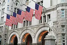 The $29 million renovation was completed in 1983. Much of the building was gutted to utilize the interior space more efficiently, but some "preservation zones" were established to retain the interior's historic character. Much of the old marble was replaced with new, pink marble, and the interior repainted in shades of cream, gray, green, and ivory pastels. A glass-enclosed elevator to the observation deck was also added,[15] as well as a new grand staircase to the second floor and two 6,000-square-foot (560 m2) restaurants.[66] The renovated building was officially dedicated on April 19, 1983. Vice President George H. W. Bush presided over the event. The re-opening was celebrated with peals from the Bells of Congress from the clock tower. Federal tenants included the Institute for Museum Services, National Endowment for the Arts, the National Endowment for the Humanities, and the President's Committee on the Arts and Humanities. (Modular office furniture was used to allow more people to work in the offices, which proved controversial among federal employees used to traditional desks and chairs.)[6] The retail levels, which occupied the first three floors of the building, opened on September 13, 1983.[67] The retail section included a performance space known as the Nancy Hanks Center.[15] Hanks died on January 7, 1983, just weeks before the building's re-opening.[68] The clock tower and observation deck reopened to the public on May 1, 1984.[69] The 1983 renovation won strong praise from architectural critic Benjamin Forgey.[70][71]
