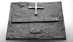 ![]() This Russian plate was buried at the time of the settlement's establishment, and is now in the Russian Bishop's House in Sitka. | |