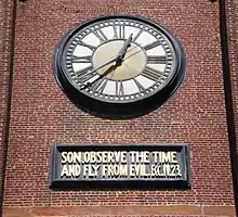 Under the clock face of Old St. Mary's appear the words: "Son, Observe the Time and Fly from Evil" (Ecclesiasticus 4:23). This sentiment was aimed at the men who frequented the surrounding brothels in the 1850s.[7]