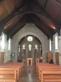 Externally the elevations are extremely simple with an unadorned ashlar lower section with small lancets let into the wall above a roll moulding to form a clerestory. The chancel has a small rose in the gable with three lancets below.[1]