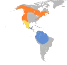 The olive-sided flycatcher is distributed throughout North and South America. Its breeding habitat ranges from California to New Mexico, all the way up to central Alaska, then across Canada (except for most of the Northwest Territories and Nunavut) and through a portion of northeastern US. Its non-breeding habitat is mainly in the northern part of South America and a small area in Central America.[4]