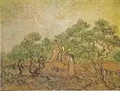 Another painting was made of olive pickers, this time a couple. Kröller-Müller Museum's Olive Grove with Two Olive Pickers (F587) was painted December, 1889.[31]