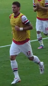 On 26 June 2012, Arsenal won the race to sign Giroud on a long-term contract for a fee believed to be around £9.6 million (€12.4 million).[93] He was given the number 12 shirt.[94] He made his debut on 18 August as a substitute for fellow debutant Lukas Podolski in a goalless home draw against Sunderland in the Premier League[95] and scored his first goal for Arsenal on 26 September, in a 6–1 win against Coventry City in the League Cup.[96] His first Premier League goal came on 6 October, with the equaliser in a 3–1 win against West Ham United, in which he also assisted a Theo Walcott goal.[97] On 30 October, he helped Arsenal to a historic comeback in a League Cup tie against Reading, as Arsenal were 4–0 down before coming back to win the game 7–5 after extra-time, with Giroud scoring Arsenal's second goal.[98] Giroud scored his first UEFA Champions League goal for Arsenal in a 2–2 draw at Schalke 04 on 6 November[99] and four days later he scored twice in a 3–3 draw at home to Fulham.[100] Giroud's form earned him a place in the Premier League team of the week.[101][102]
