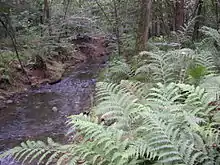 The Valganna branch also gives rise to the Fonteviva lake, dedicated to sport fishing,[16] and to the Valganna waterfalls, which in winter, due to the harsh climate, are often frozen. They are found in the municipality of Induno Olona and are close to the famous and homonymous caves.[17] On the waterfalls, which were artificially created at the beginning of the 20th century to improve water withdrawal, one can admire the phenomenon of travertine surfacing.[18]