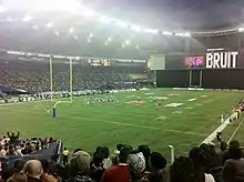 The Canadian Football League's Montreal Alouettes became the stadium's first major post-Olympic tenant when they moved their home games there halfway through the 1976 season. Capacity was reduced from its Olympic capacity of 72,000 to 58,500, but leapt to 66,308 when the natural grass was replaced with AstroTurf ahead of the 1977 season.[7] The Alouettes remained there through 1986, the franchise's final season of operations; the team would shut down shortly after the start of the 1987 season. A revived Alouettes franchise returned for the 1996 and 1997 seasons, but then moved to the Percival Molson Stadium in 1998. The Alouettes used Olympic Stadium for select regular season games until 2009, and playoff games until 2014. Due to the increased popularity of the Alouettes and the small capacity of Percival Molson Stadium, the team considered returning to Olympic Stadium on a full-time basis, but instead renovated Percival Molson Stadium to increase its capacity.[46] In addition, the stadium holds the record for the largest Grey Cup attendance, that of the 1977 Grey Cup game, in which the hometown Montreal Alouettes defeated the Edmonton Eskimos, 41-6 before 68,318 spectators; this despite a local transit strike and harsh winter weather conditions.[47]