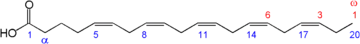Chemical structure of α-linolenic acid (ALA), a fatty acid with a chain of 18 carbons with three double bonds on carbons numbered 9, 12, and 15. Note that the omega (ω) end of the chain is at carbon 18, and the double bond closest to the omega carbon begins at carbon 15 = 18−3. Hence, ALA is a ω−3 fatty acid with ω = 18.