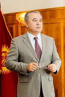 Omurbek Chirkeshovich Tekebayev (Kyrgyz: Өмүрбек Чиркешович (Чиркеш уулу) Текебаев, Ömürbek Çirkeşoviç (Çirkeş uulu) Tekebayev) is a Kyrgyz politician. He was Speaker of the Kyrgyz Parliament from March 2005 to March 2006.[1] Tekebaev is the leader of the Ata-Meken socialist party. Tekebayev is currently serving an eight-year jail sentence for corruption and fraud.[2]