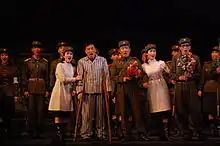 According to Kim, Sea of Blood, the production of which he oversaw in 1971, is the exemplar of a perfect opera.[14] Because Sea of Blood preceded the publication of On the Art of Opera, it is likely that Kim was in the process of systematizing his thought at the time.[lower-alpha 1] Sea of Blood was quickly followed by four similar operas:[30] A True Daughter of the Party (1971), The Flower Girl (1972), Tell O' The Forest! (1972), and The Song of Mount Kumgang (1973), all of which according to Kim are either written by or otherwise closely associated with Kim Il-sung.[31] These are collectively known in North Korea as the "Five Great Revolutionary Operas".[32]