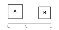 Now, since an even number of equal weights, equally spaced, have their centre of gravity between the two middle weights, A is in fact applied at E, and B at D, as the proposition requires. Further, the total system consists of an even number of equal weights equally distributed, and, therefore, following the same law, C must be the centre of gravity of the full system. Thus A applied at E, and B applied at D, have their centre of gravity at C.[1]