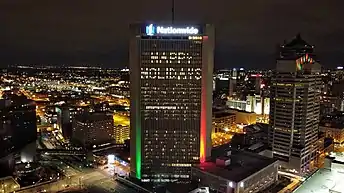 The building was designed by Brubaker/Brandt (the same firm that designed Rhodes State Office Tower, the tallest building in Columbus) and Harrison & Abramovitz.[1] The façade is dark vertical steel ribs bordered by white limestone ends which follows the modernist style. Blue spotlights light the exterior at night, mimicking the blue box logo of Nationwide Mutual Insurance. In December the interior lights are set so that it reads "happy holidays" to observers of the building, with thematic messages similarly displayed during other holidays and special events. The glass elevator on the side of the building is an express elevator, skipping most office floors, that once went up to a restaurant on the 38th floor of the building, called One Nation. One Nation lasted many years, but closed in 1997, and the glass elevator is permanently out of service.
