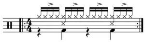 The backbeat is characterized by the dominant snare drum stroke (usually a click produced by cross-sticking) and bass drum both sounding on the third beat of every four, while beat one is left empty. Thus, the expected hit on beat one is "dropped," creating the one-drop effect. Dropping out the bass on the "one" of the measure further accentuates the downbeat of the drums creating the rhythm.[12]